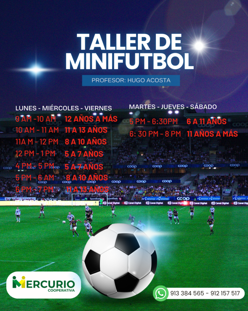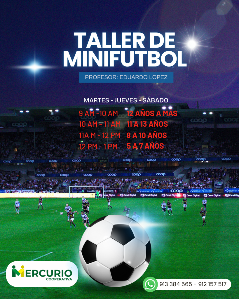 El taller de Minifútbol de la Cooperativa Mercurio es el espacio ideal para que los niños inicien su camino en el deporte rey. Enfocado en la formación integral, este curso busca desarrollar las habilidades físicas y técnicas de los pequeños en un ambiente de sana competencia y compañerismo.